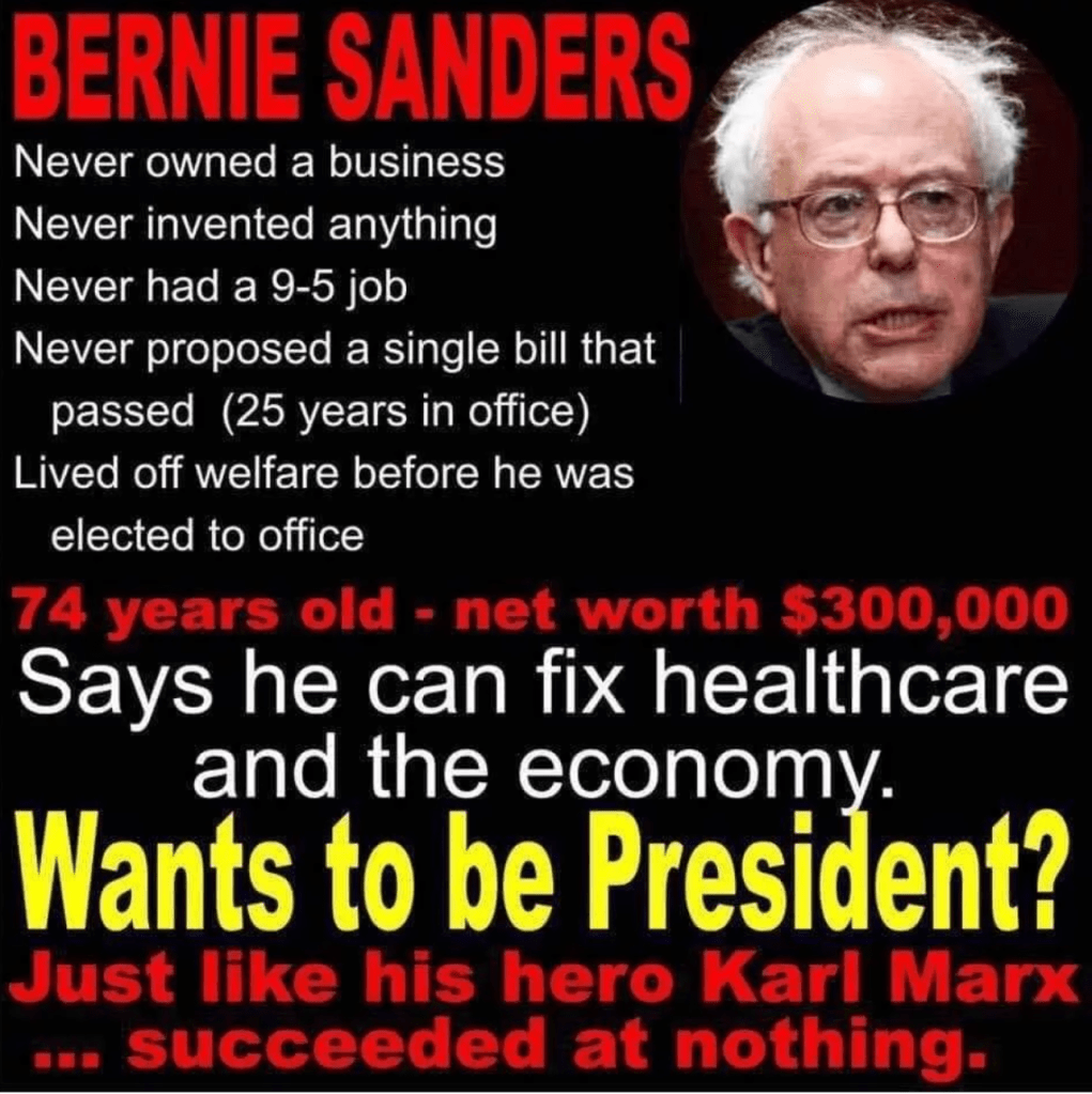 It is clear through fact checking some of the key claims within this meme that it is not an accurate assessment of Bernie Sanders’ life both before and during his political career. Both the Snopes fact check of this meme and Putterman’s Politifact article confirm that — while some aspects, such as Sanders never having invented something, are true — there is key information that ranges from being misrepresented to completely false. For example, it could be argued that the claim of Sanders “living off of Welfare” could have been a misunderstanding or miscommunication, but the claim of him never having sponsored a bill that was passed into law was simply untrue.